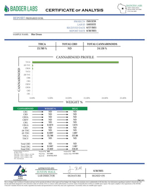 All BackWoodz premium hemp flower products go through 3rd party testing and organically grown without the use of pesticides. Blue Dream tests out with a 24.12% THCA and under .3% Delta-9 THC. BackWoodz hemp flower is U.S Farm Bill compliant under the Agriculture Improvement Act (Sec. 10113).