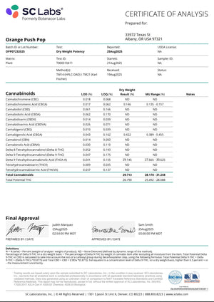 All BackWoodz premium hemp flower products go through 3rd party testing and organically grown without the use of pesticides. Orange Push Pop tests out with a 29.14 THCA% and under .3% Delta-9 THC. BackWoodz hemp flower is U.S Farm Bill compliant under the Agriculture Improvement Act (Sec. 10113).